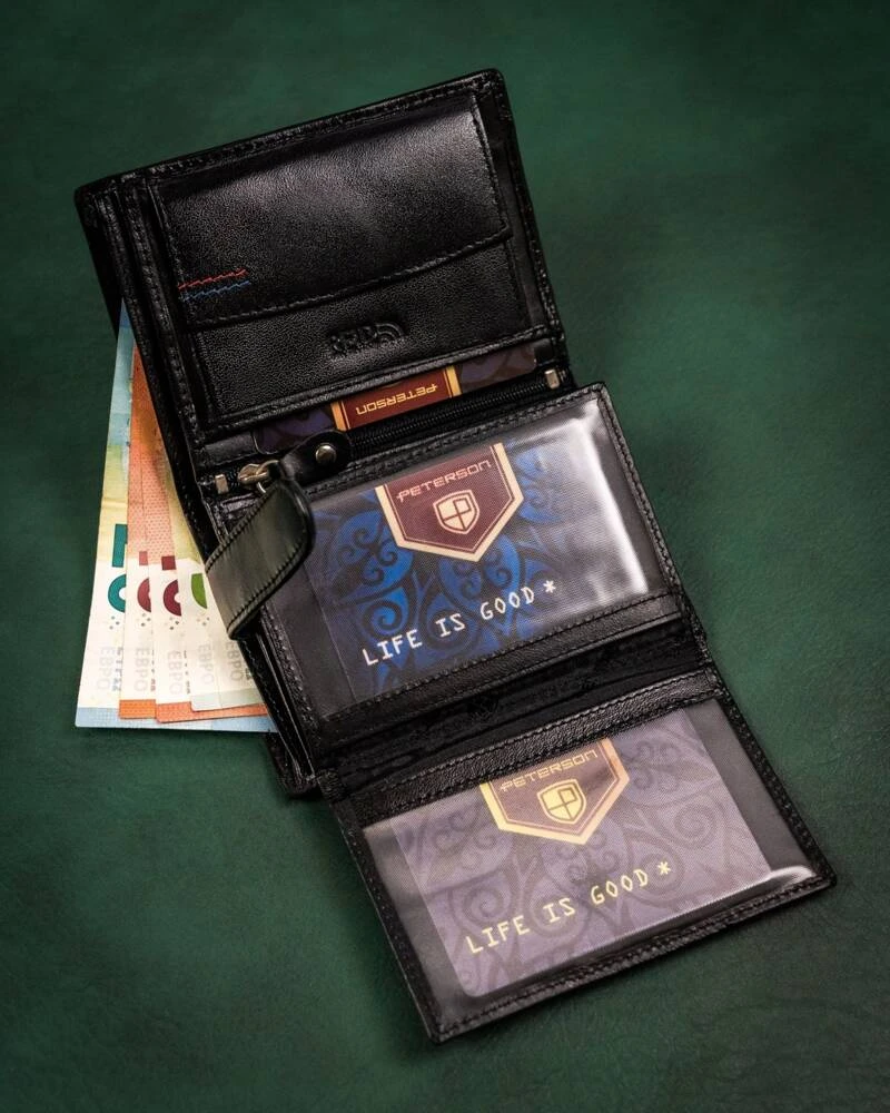 Środek portfela został zaprojektowany tak, abyś mógł zmieścić wszystkie karty, dokumenty i pieniądze, które na co dzień potrzebujesz. Przegródki na karty i dokumenty są zabezpieczone odporną na otarcia logowaną podszewką. Pozwala to uniknąć uszkodzeń na skórze, podczas wkładania i wyjmowania kart.