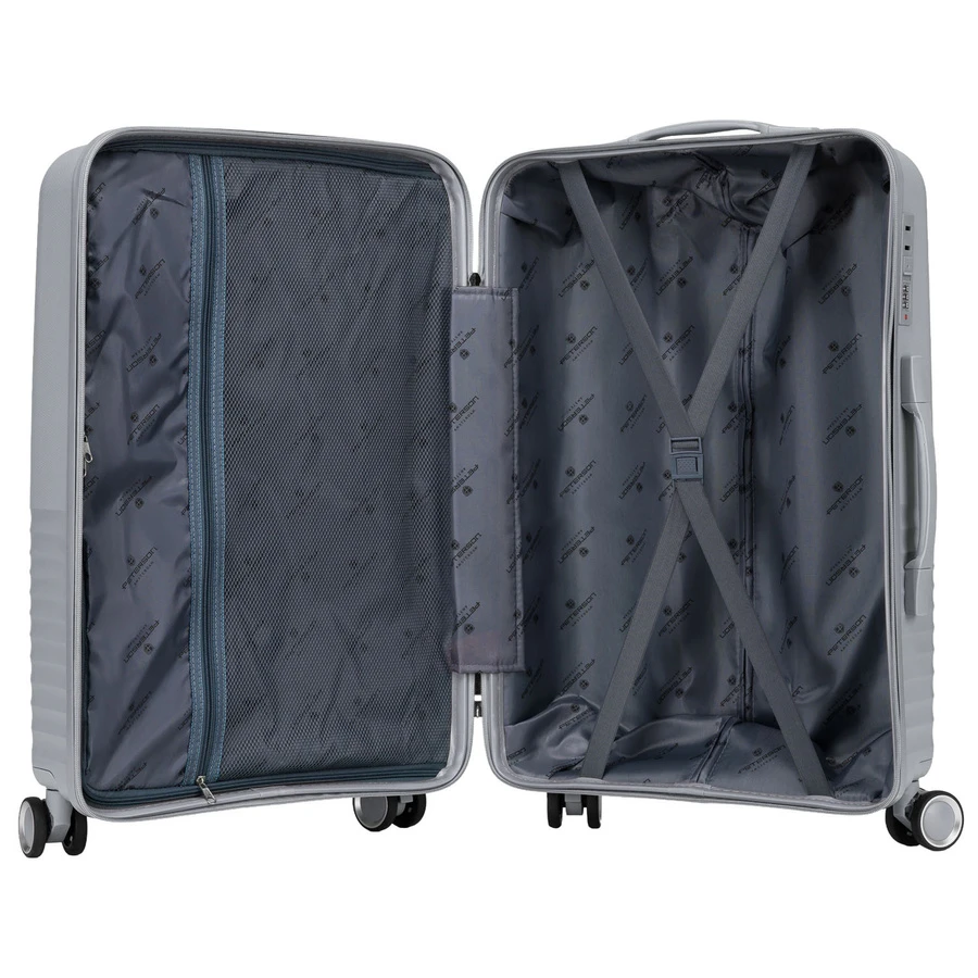 Każda walizka ma dwie pojemne komory – jedna zamykana na suwak z siatkową przegrodą, a druga z elastycznymi pasami krzyżowymi, które stabilizują zawartość. Wnętrze pokryte jest elegancką, logowaną podszewką, która chroni przed przetarciami. Praktyczna kieszeń na suwak pozwala uporządkować drobiazgi i dokumenty.