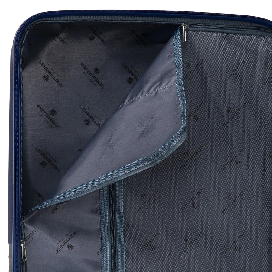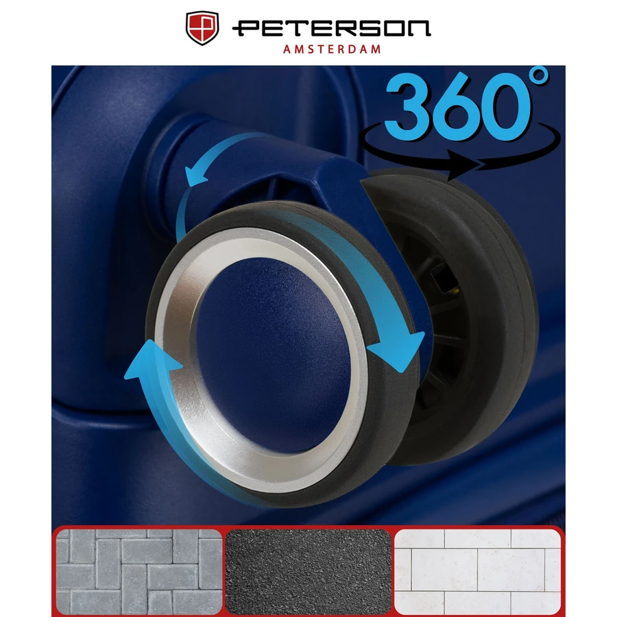 Wytrzymały zestaw walizek Peterson wykonany z odpornego na uderzenia ABS-u w eleganckim granatowym kolorze. Wnętrze z praktycznymi przegrodami i elastycznymi pasami pomaga utrzymać porządek w podróży. Obrotowe kółka 360° i teleskopowy uchwyt z regulacją zapewniają komfortowe prowadzenie walizki. Zamek szyfrowy dba o bezpieczeństwo Twojego bagażu.