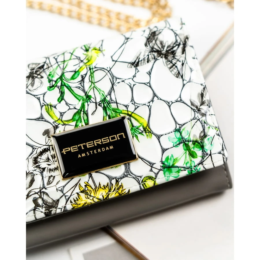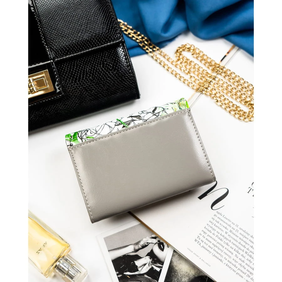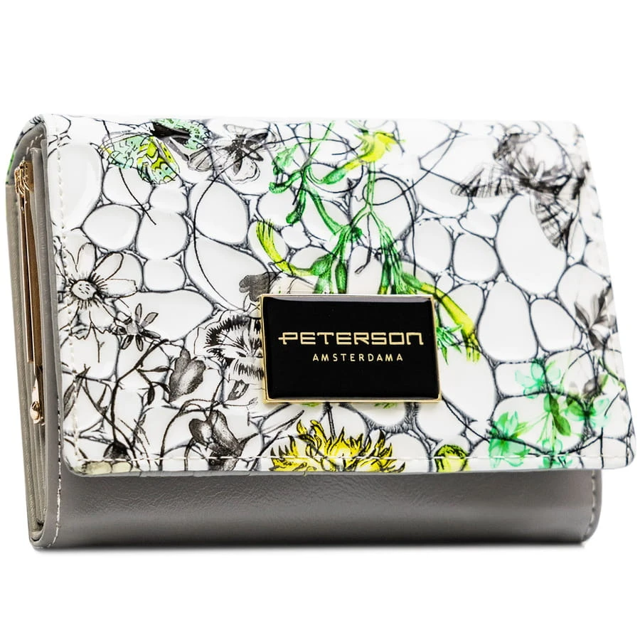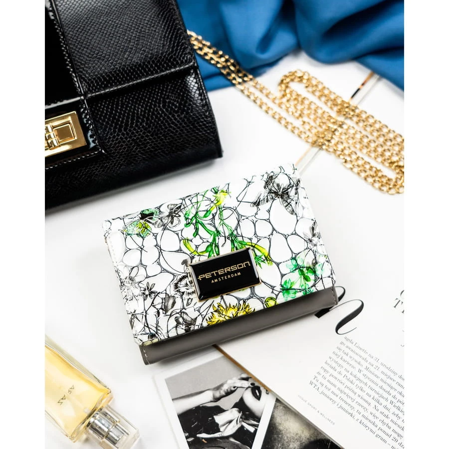 Zielony portfel damski ze skóry naturalnej z systemem RFID ozdobiony kwiatowym wzorem - Peterson