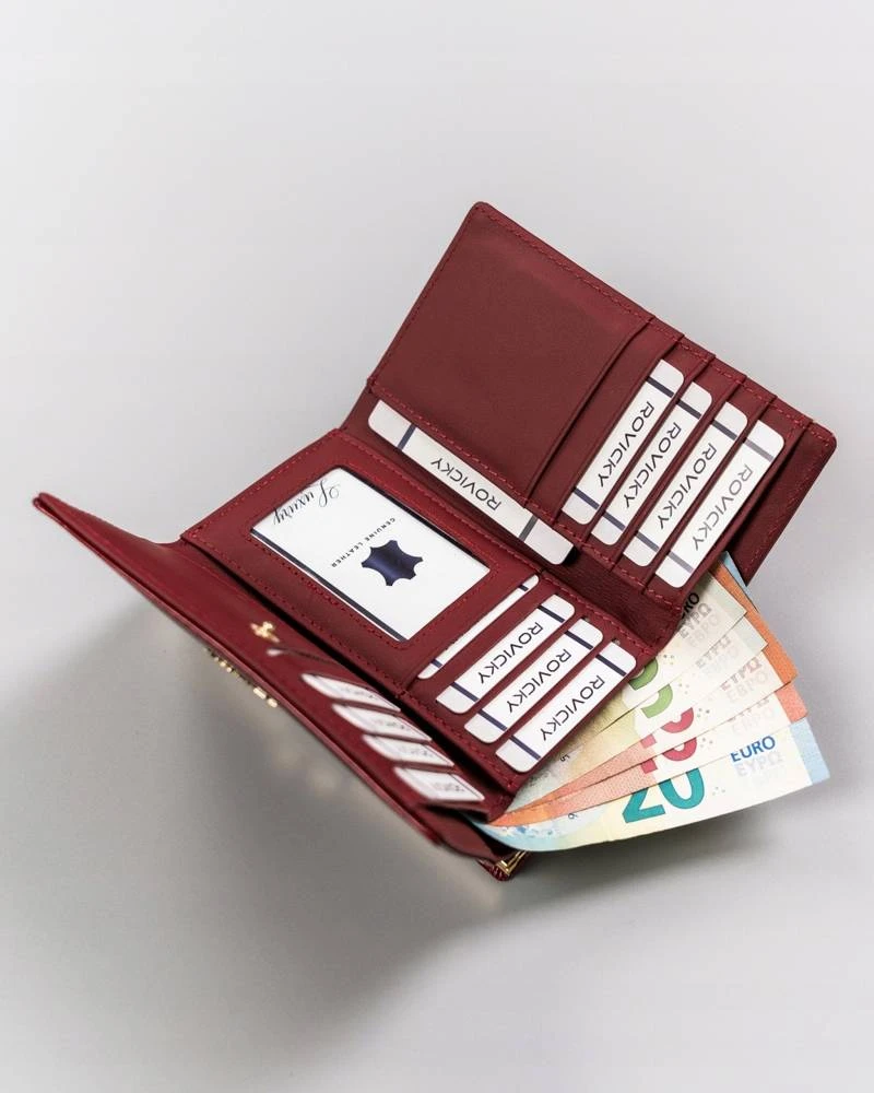 - na banknoty wydzielone są 2 duże przegródki. Jedna z nich jest otwarta, druga zapinana na suwak.